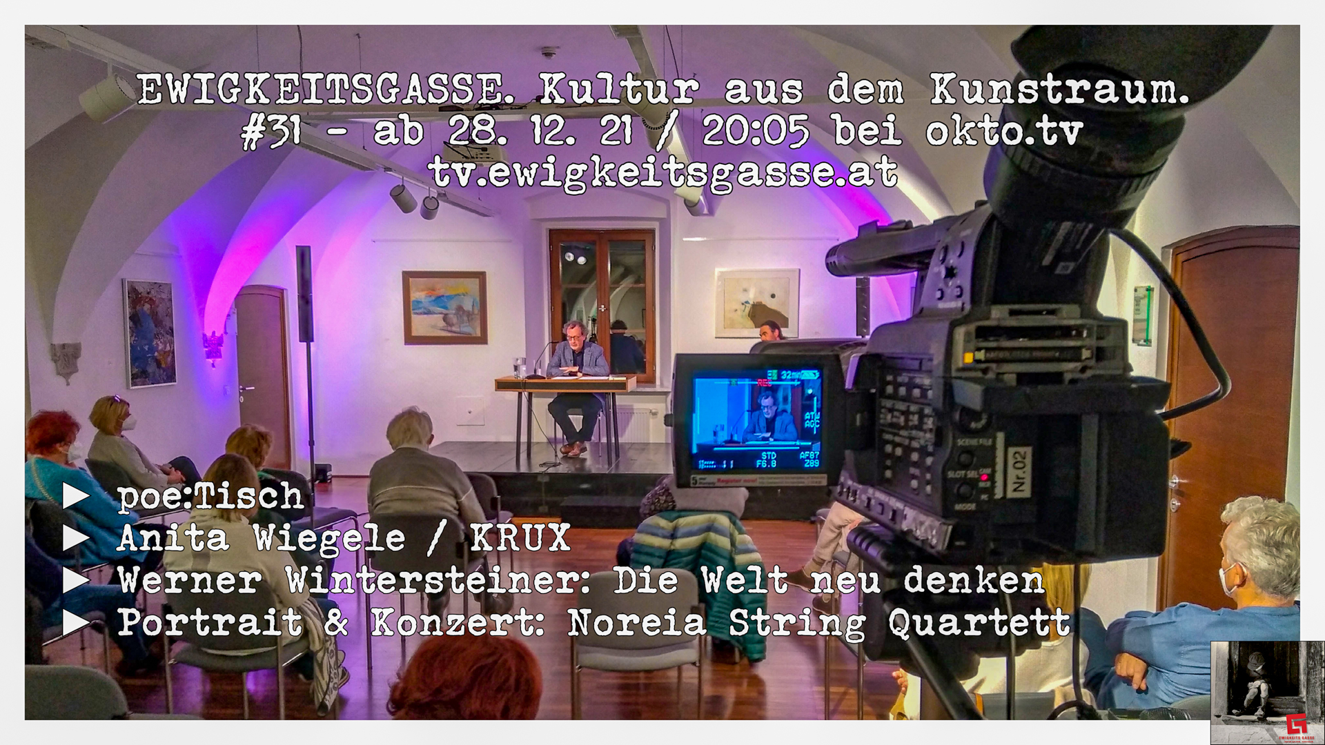 ► Hans Haider (Erinnern Villach) über Impfkritik und Antisemitismus bei Corona-Demonstrationen. ► Werner Wintersteiner stellt sein neues Buch DIE WELT NEU DENKEN LERNEN vor und fragt sich, welche Lehren wir aus Corona und anderen globalen Krisen ziehen. ► Anita Wiegeles Ausstellung KRUX im Kunsthaus Sudhaus in Villach. ► Ein Besuch beim „Literaturstammtisch“ poe:Tisch in Vassach. ► Ein letztes Konzert vor dem vierten Lockdown in Österreich: Das NOREIA STRING QUARTET im Portrait.